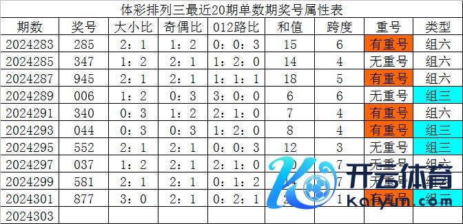 体彩罗列三最近20期单数期奖号辞别为:285、347、945、006、340、044、552、037、581、877,各期奖号详备属性下表: