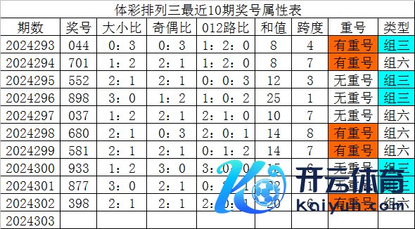 开奖回来:体彩罗列三第2024302期开出奖号:398。
