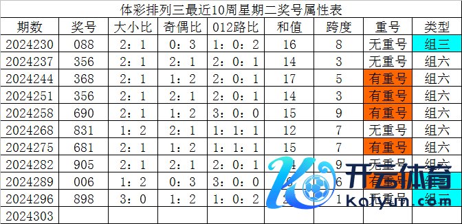 体彩罗列三最近10周星期二奖号辞别为:088、356、368、356、690、831、681、905、006、898,各奖号属性详见下表: