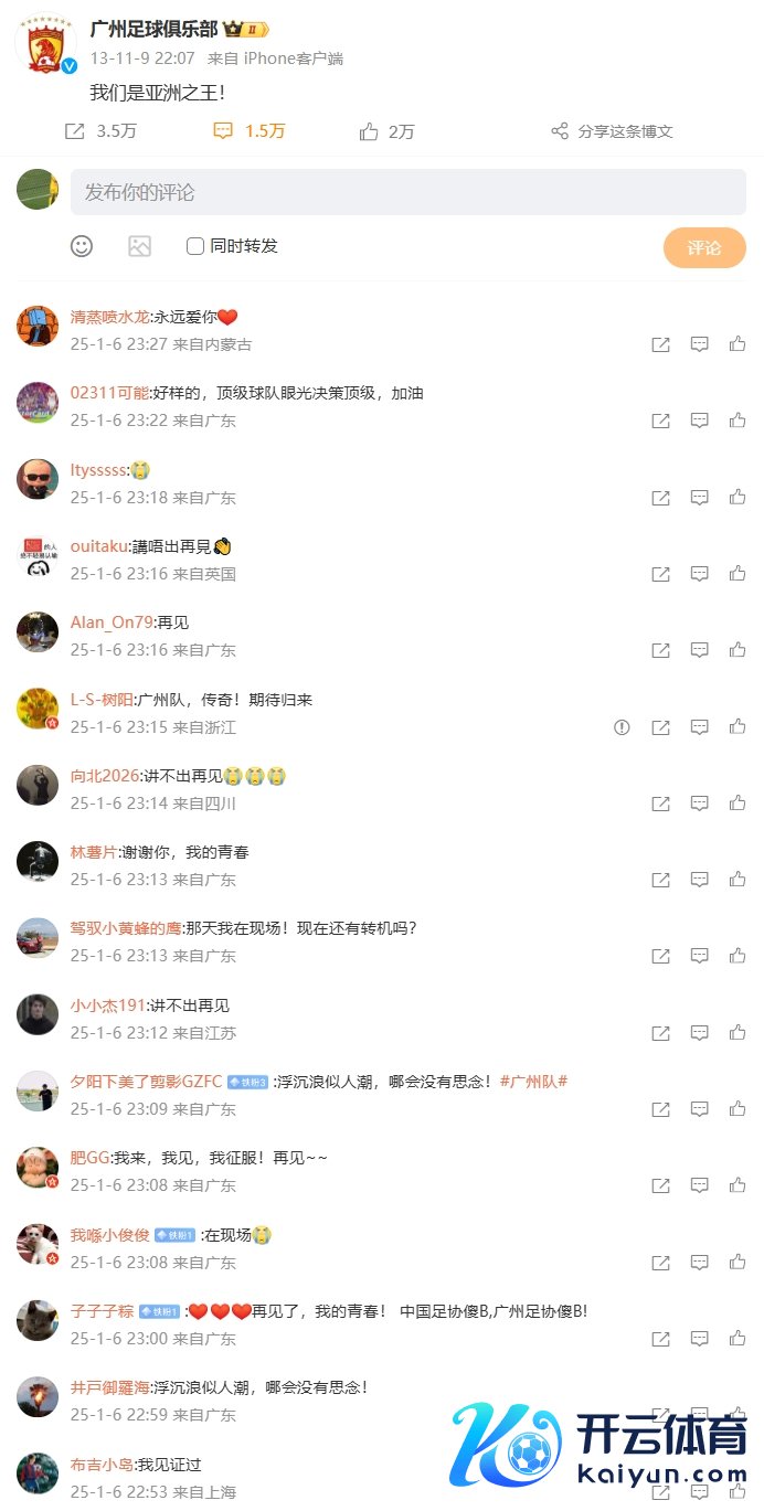世界买球体育信息 1月6日讯北京技术1月6日,广州队官方告示,俱乐部未获准入,无法链接栽植中国足球做事联赛。 2013年11月9日,广州恒大夺得亚冠冠军,中国俱乐部初次站在亚洲俱乐部赛事的最高领奖台上。 今天,广州队那条“亚洲之王”的微博被球迷刷屏! 世界买球体育信息 八冠王驱散!广州队未过2025足协准入