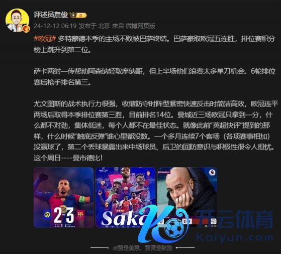 直播吧12月12日讯 本轮欧冠多场战罢体育集锦,赛后批驳员詹俊在个东谈主社媒上点评了几场比赛。