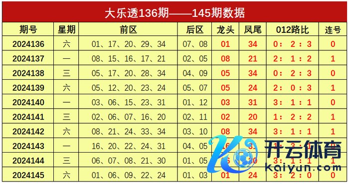 大乐透第2024145期出奖号统计:前区01、06、09、22、24体育集锦,后区01、03。龙头01,凤尾24,012路比为3:2:0,未开出连号。