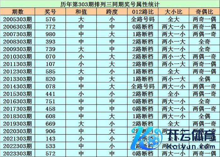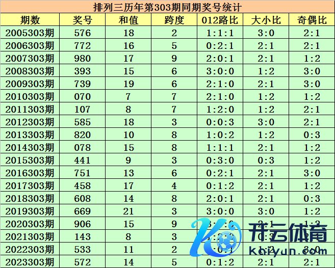 历史上第2024303期胪列三已开出19期奖号了,积年同时奖号折柳为:576、772、980、393、739、070、107、585、820、078、441、751、458、608、669、906、143、533、572,详备统计见下表: